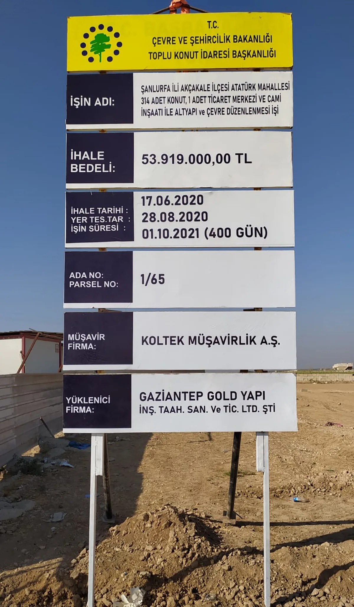| İŞİN ADI | : | Şanlıurfa İli, Akçakale İlçesi, Atatürk Mahallesi 314 Adet Konut, 1 Adet Ticaret Merkezi ve Cami İnşaatı Altyapı ve Çevre Düzenleme İşi |